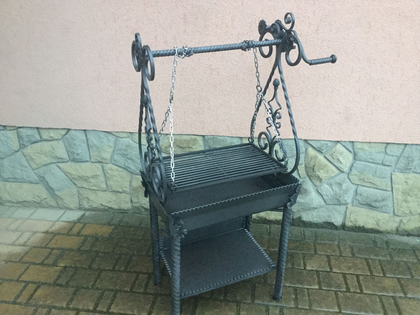 Grill kuty prostokątny obudowa paleniska i samo palenisko wykonane jest z blachy grubości 3mm. Boki grilla na którym jest zawieszony ruszt kwadrat pełny 12x12mm z elementami kutymi. Sam ruszt wykonany jest z pręta kwadratowego 12x12mm ,pręty rusztu 8mm w odstępie co 16mm i dodatkowo wzmocniony.